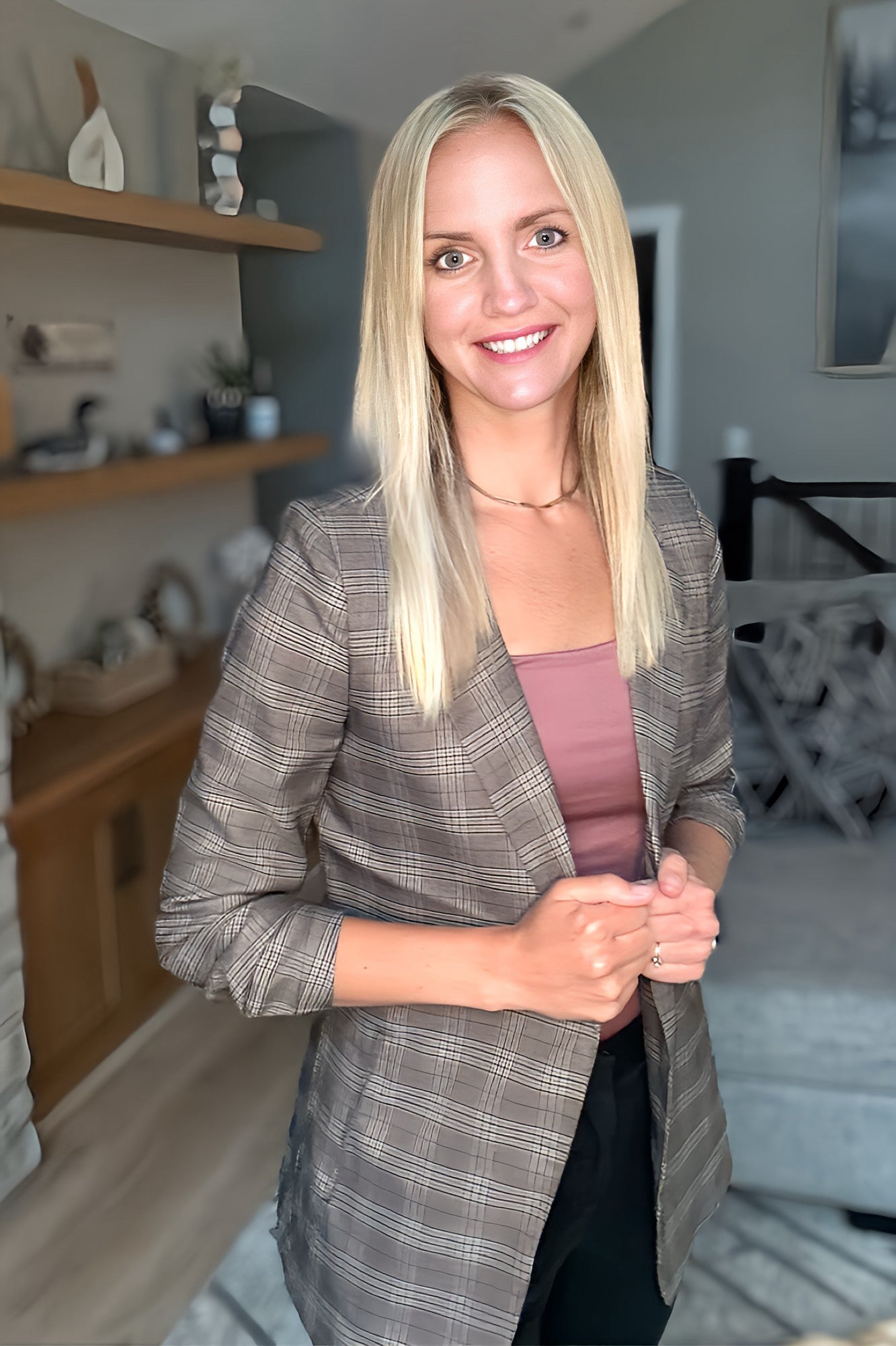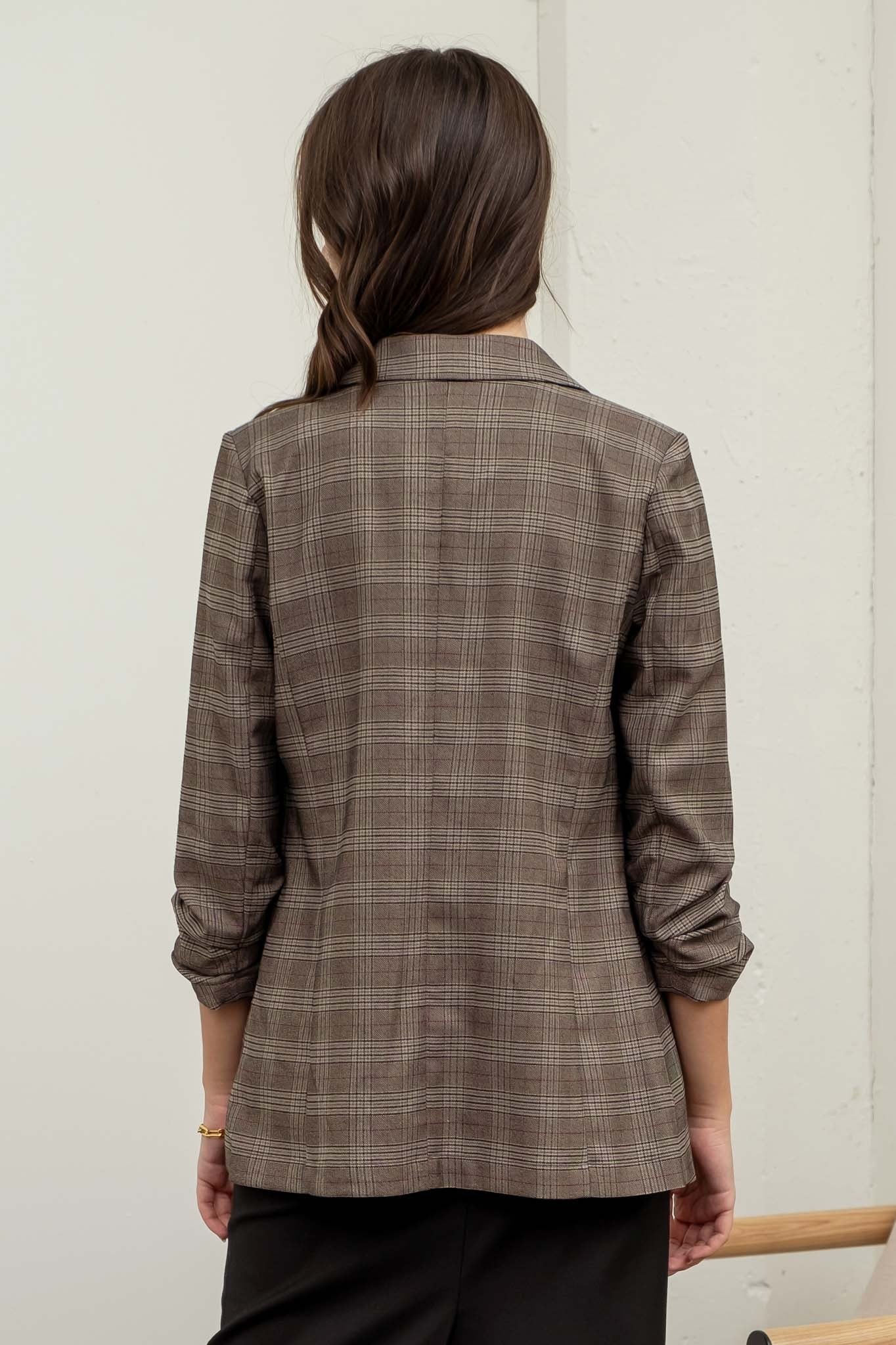 Plaid Rouched Sleeve Blazer